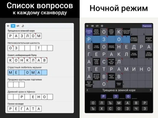 - Список вопросов к каждому сканворду: все задания перед глазами.