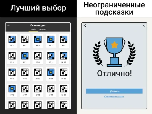 - Сканворды можно приближать, чтобы было удобно играть даже на маленьком экране.