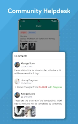 * Community Helpdesk - Ensure Customer Delight through quick action on Service Requests, Queries, Complaints. You can view all the Helpdesk requests which are raised by the residents of your Community. You can also see the status of the ticket and take action based on the status. You can provide updates which become available to residents in their App. The end to end life cycle of Requests/Complaints can be managed using this module.