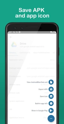 Installed apps can be saved to device storage and shared. App icon can be saved as well! App decodes the main metadata file AndroidManifest and saves it as a readable xml to an external storage.