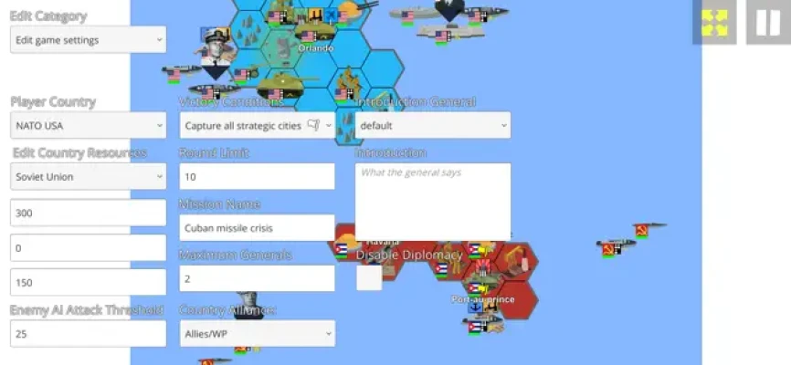 Like I said, you can create your own maps; you can even upload them for the world to see! The map editor is readily available for use inside the base game. Every aspect of a mission is customizable: a country’s alliance, resources, cities, airports, troops, veterency, troop attack distance, winning conditions, and even which troops have generals can be customized.