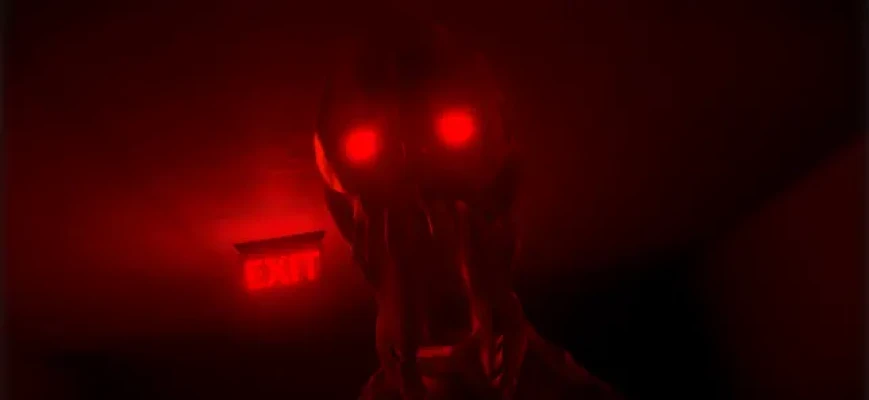 Enter the terrifying world of Level "Run For Your Life" from the Backrooms, where you're trapped in a long corridor with red glowing Exit signs and chased by a deadly monster.