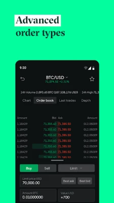 * Access to real-time market insights, including order book, last trades, market depth, and charts for all assets