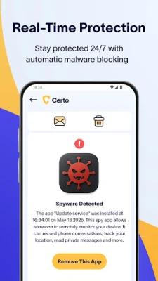 Certo AntiSpy is your all-in-one solution for mobile privacy and security. Whether it’s malicious spyware, intrusive apps, or insecure networks, Certo protects your device and personal data 24/7.