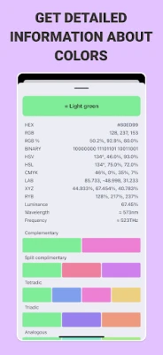 Receive detailed information about each captured color, including complementary colors, shades, lightness, darkness, tetradic, triadic, analogous, and monochromatic colors. This data helps you understand the relationships between colors and unlock new possibilities for your creative projects.