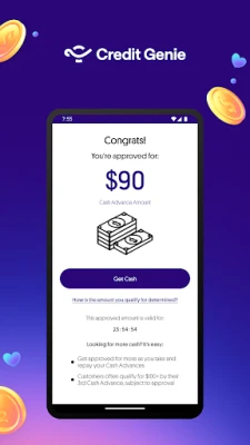 *Offer approval and amount subject to eligibility requirements. Not available in all states. Approved offers range from $10 - $100 for first-time customers. For repeating customers, the amount ranges up to $150. Customers must connect a bank account to Credit Genie to apply for a Cash Advance. Not all customers who apply for a Cash Boost will qualify. Credit Genie charges a recurring fee of $4.99 biweekly (Bank Connection Fee) to maintain a customer's bank account connection. Customers can stop the recurring fee by disconnecting their bank account at any time within the app. Paying the Bank Connection Fee does not guarantee approval for a Cash Boost. Credit Genie's Cash Boost service is unavailable to residents of Connecticut, Maryland, Nevada, Hawaii, or Washington, D.C. To receive funds as quickly as within minutes, customers must select the associated delivery option (additional fees apply). Most customers who select the option receive their funds within 30 minutes.