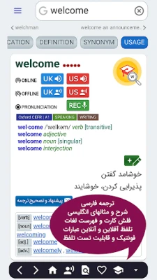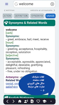 دیگر نیازی به خرید چندین لغت نامه نیست! كافیست پس از اجرای ok برنامه TDictionary ، لغت انگلیسی مورد نظر را وارد نمایید تا ضمن گوش دادن به تلفظ آن ، معنی فارسی ، كلمات مترادف ، کاربرد لغت در Speaking و Writing ، لغات ضروری آزمون تافل ، لغات ضروری آزمون آیلتس ، مجموعه 504 لغت کاربردی و ... را در یک صفحه ملاحظه نمایید.
