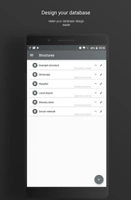 You can create tables, keys, columns, and change parameters, colors for it, and many others. For creating SQL just tap one button and use SQL in your database. If you want to show scheme somebody, just exports in a picture and sends it. Without ads.