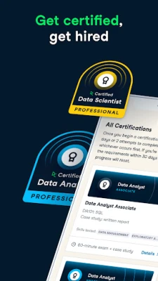 • Become a certified professional: Showcase your skills with certifications across Power BI, Tableau, SQL, and more. Whether you’re aiming to become a Data Analyst, Data Scientist, or AI Engineer professional, DataCamp certification proves you're ready for the job.