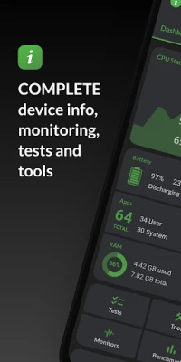 The pro version includes access to all tests and tools, benchmarking, battery monitor, widgets and floating monitors.