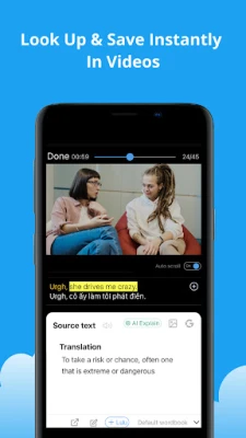 • Instantly look up words, translate phrases, and get AI-powered explanations - right on the video.