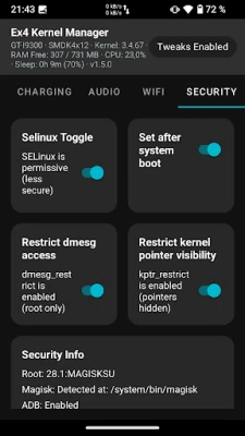 -Security: Selinux enabler / disabler, dmesg restriction, kernel pointer restriction, ...