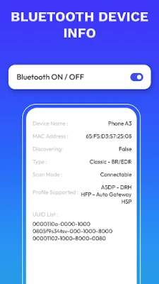 • Bluetooth Info & Details — View device name, MAC address, UUID, battery (if available)