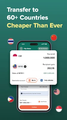 Transfer from Rupiah to MYR (Malaysian Ringgit), SGD (Singapore Dollar), CNY (Chinese Yuan), THB (Thai Baht), PHP (Philippine Peso), INR (Indian Rupee), all possible with Flip Globe. Transfer funds to e-wallets and international banks such as TNG, GCash, WeChat, Alipay, Momo Pay, PayNow, UPI, Maybank Malaysia, CIMB Malaysia, Bangkok Bank, Kasikom Bank, BDO Unibank Inc., DBS Singapore, OCBC Singapore, HDFC India bank, ICICI, and various other destinations. Flip Globe is an application for sending money abroad besides Topremit, Wise, TransferWise, & Western Union.