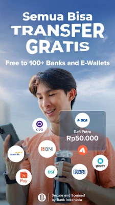 Transfer money using Flip to BCA, myBCA, BCA mobile, Blu by BCA, BRI, BRIlink, Mandiri, Livin’ by Mandiri, BNI (Wondr), BSI (BYOND), CIMB, Bank Jago, BTN, Muamalat, BTPN, Jenius, Permata, Superbank, Seabank, Neobank, Bank Saqu, Allobank, OCTO, and 100+ other banks, including Digital Banks and Regional Development Banks, for free!