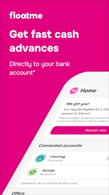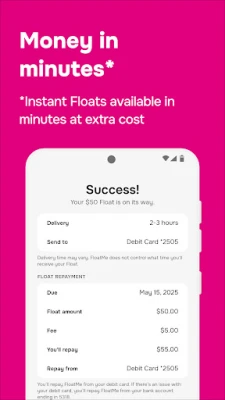 Membership is required to request cash advances; approval of your request is not guaranteed. Membership costs $4.99/month and provides access to FloatMe's suite of financial products and services. Not available in all states. Advances are NOT loans and have no mandatory min or max repayment period. FloatMe's advance service is not a loan nor is it a contracted obligation to repay a loan. We are NOT a payday loan, cash loan, or personal loan app, nor an app to borrow money. Money advanced has 0% max interest. 0% APR. Instant Float fees are not included in the monthly membership cost and are optional. Instant transfer fees vary from $1-$7.