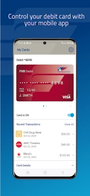 You have the convenience and peace of mind to manage your FNB Debit Card through Online and Mobile Banking. Control where and how your debit card can be used by enabling or disabling your card, setting spending limits by dollar amount, restricting card usage at certain merchants by category and limiting card usage to specific geographic locations.