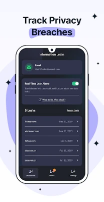 - Scans for compromised data associated with the email address used to login in the app