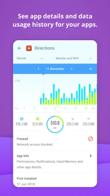 • Instantly know every time a new app accesses the network and begins using Wi-Fi or mobile data.