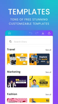 Install this Charu canvas graphic design app to easily create professional designs by using all the photo editing and graphic design editor features, just in one app.