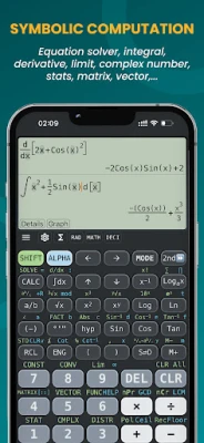 - Scientific calculator: complex number, calculus, integral, derivative, limits, prime factorization, matrix, vector, statistics and distribution