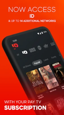 Link your pay TV provider (cable, satellite, telco, live TV streaming service) to access ID favorites like Evil Lives Here, On the Case with Paula Zahn, See No Evil, People Magazine Investigates, American Monster, Fear Thy Neighbor, Web of Lies and many more - plus top shows from other networks including Home Town (HGTV), Naked and Afraid (Discovery), Diners, Drive-Ins and Dives (Food Network), Ghost Adventures (Travel Channel), My 600-lb Life (TLC) and more. New episodes are available the same day as they premiere on TV.
