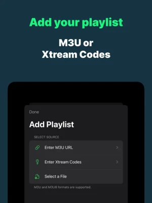 • Import your IPTV playlist from a web URL, a local file, iCloud, or using your Xtream Codes credentials.