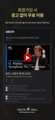 - 국내 교향악단 최초 온라인 콘서트홀 - 쉽게 찾을 수 있는 편리한 검색 시스템- 지난 60여 년간 축적된 수백 개 공연 아카이브 - 모든 콘텐츠 무료 감상 - 흥미로운 Only 디지털 K-Hall 독점 콘텐츠 와 푸짐한 이벤트