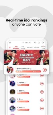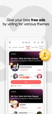 Real-Time Kpop Idol VotingCheck out real-time idol ranking at a glance.Get your bias rise in the charts & win exclusive rewards!