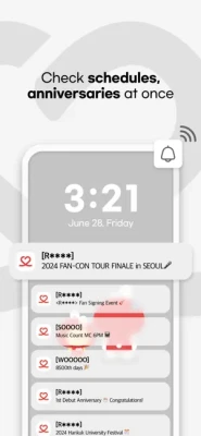 Keep track of your idol's schedule – comebacks, concerts, fan meetings, birthdays, anniversaries, album release dates, award shows, music shows and song releases.