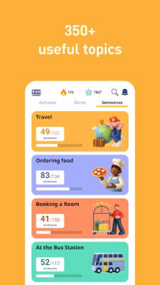 β’ 5,000 Greek phrases (frequently used): the most important phrases for daily conversations and travelling, categorized into 10 levels and 120 topics.