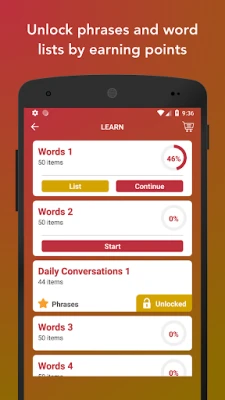 - Earn points by learning and practicing. Then unlock phrases and word lists.