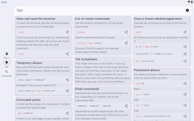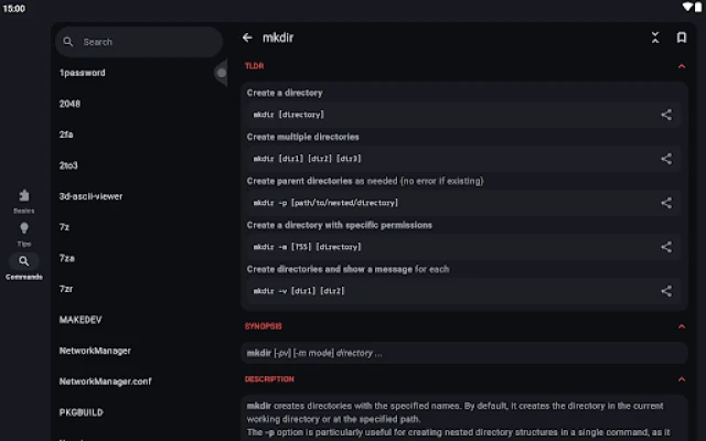 The app currently has 8436 manual pages, 28 basic categories and a bunch of general terminal tips. It works 100% offline, doesn't need an internet connection and has no tracking software.