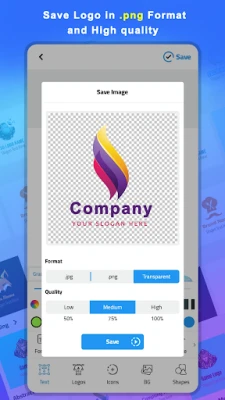 6 - You can save your logo in multiple formats like png and jpg and with high accuracy, as well as save the logo on a transparent background.