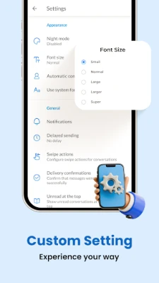 Tailor the app experience to your needs with font sizes, theme options, and notification preferences. Enjoy messaging your way with full customization.