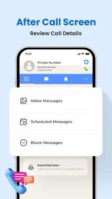 Messages : SMS Texting App shows an aftercall enabling you to identify incoming calls as they happen, so you can block messages, and view your inbox or scheduled messages, immediately after the incoming call. This enables you to have access to your inbox and scheduled messages, and share them with friends and family after calls.