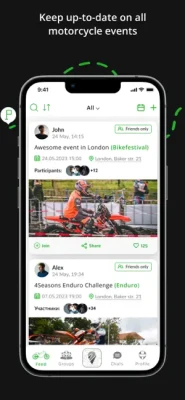 Events: Keep up to date with all the motorcycle events nearby or create your own and invite people to attend.