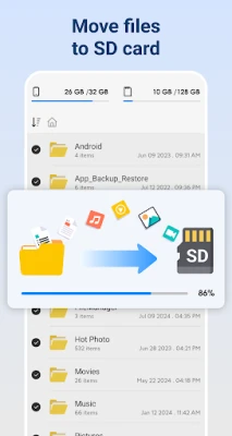 SD File Transfer is fast solution to move your files from internal memory to SD card few simple steps. Move your photos, videos, music files, zip files, and all other downloads from your phone memory to SD card.