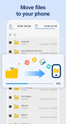 With this app, you can free up your device internal memory by move your files to the SD card, or copy files from the SD card to your phone for easy management and use. Just select files you want to move or copy (back up), click a big button and that’s all, fast and easy.