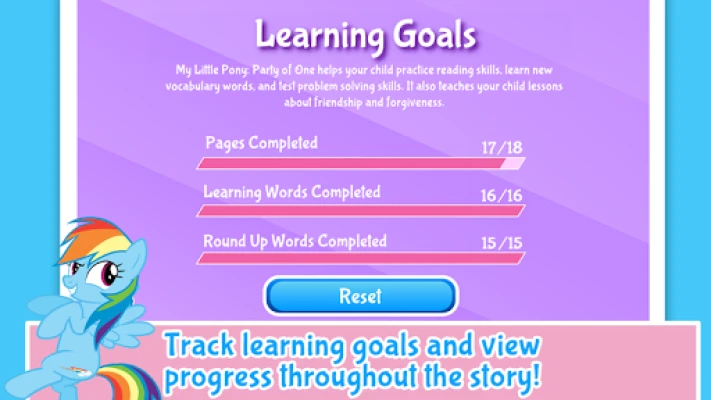 Bold graphics, bright colors and lots of animations make Party of One an enjoyable and engaging way to be entertained and practice reading skills. Perfect for My Little Pony fans and beginning readers.
