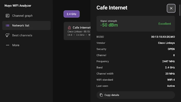 - 🔍 Details card: Distance estimate, max link speed, BSSID/MAC, frequency, quick share/copy tools.
