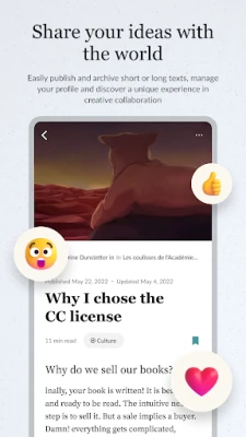 Literature, articles, blogs, essays, tribunes, creators publish and archive fiction and non-fiction in their creative spaces: Creative Rooms.