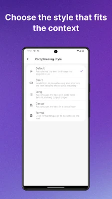 - Variety of Paraphrasing Styles: Whether you need a general, short, long, casual or even formal rewriting of your text, The Paraphrasing App can help you with all of them.