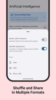 Question Papers can be Shared With or Without Answers as Text and PDF. Questions in Question Paper can be shuffled each time you share to ensure new Question Paper Set. Answers of each question is shuffled by default.