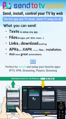 Send to TV Quick is the next-generation Sideloading and Remote Management Tool for Android TV, Google TV, and Fire TV. Re-engineer your TV experience by moving the control interface from the clumsy remote to your Smartphone or PC Web Browser.