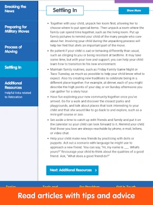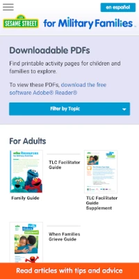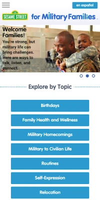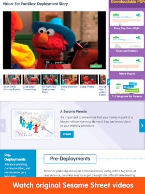 Developed for parents and caregivers: The Sesame Street for Military Families app puts all of Sesame’s bilingual (English & Spanish) resources for military families right in your pocket! Use your mobile device to access engaging videos, articles, storybooks, parent guides, and more to help you support your preschool and school-aged children as they encounter transitions common to military families.