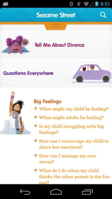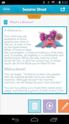 The Sesame Street: Divorce app provides parents and caregivers with tools to help children ages 2-8 cope with the many transitions related to divorce or separation.