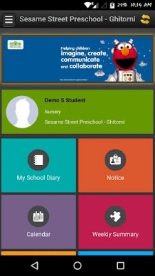 This mobile application is for parents and students of Sesame Street Pre School and effort towards bringing your favourite Pre School of India a step closer to you. Now receive each and every update from Sesame PreSchool using CoolG's cloud solution. As a parent, now you know what your kid is learning, doing or enjoying in school within a click and as a student you can check your homework, diary, assessment with just a few clicks.