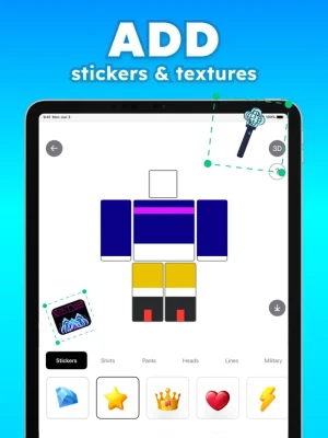 Stand out among other players! In our app you will find a library with hundreds of amazing template options to create your own appearance. Choose the template you want and use the tools you need to edit the look you've created, then add cool textures and stickers to add even more creativity and color to your work. Turn a gray silhouette into a bright and beautiful look!