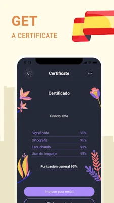 Vocabulary builder: unlock and memorize words easily while enjoying the process! Learn Spanish from a comprehensive Spanish dictionary anywhere, any time! Our Spanish learning app with flashcards in Spanish makes practice fun and effective regardless of your skill level. Earn a Certificado en Espaรฑol by passing the final test and showing your confident language learning skills.